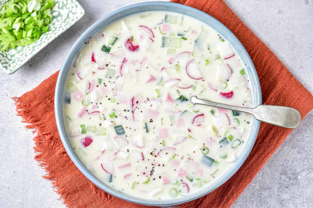 Okroshka là món súp lạnh độc đáo, thường được dùng vào mùa hè. Nguyên liệu bao gồm rau củ thái nhỏ, trứng luộc, thịt nguội và đặc biệt là kvass hoặc kefir. Sự kết hợp này tạo nên hương vị thanh mát, giúp cân bằng khẩu vị trong những ngày nóng.