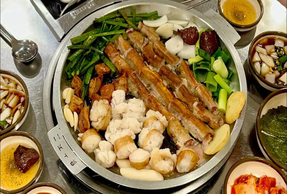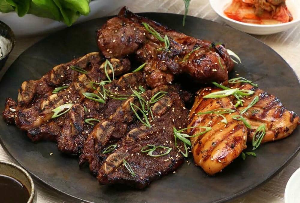 Galbi là món sườn bò hoặc sườn heo được ướp kỹ với nước tương, tỏi, lê xay, đường và dầu mè trước khi nướng trên bếp than hồng. Phần thịt mềm, thấm vị và có hương thơm hấp dẫn khi chín tới. Khi thưởng thức, thực khách thường cắt nhỏ miếng sườn, cuốn cùng rau sống, tỏi, ớt và kimchi rồi chấm thêm tương đậu. Sự kết hợp này tạo nên trải nghiệm ẩm thực tròn vị, vừa đậm đà vừa tươi mát, đặc trưng của phong cách ăn uống Hàn Quốc.